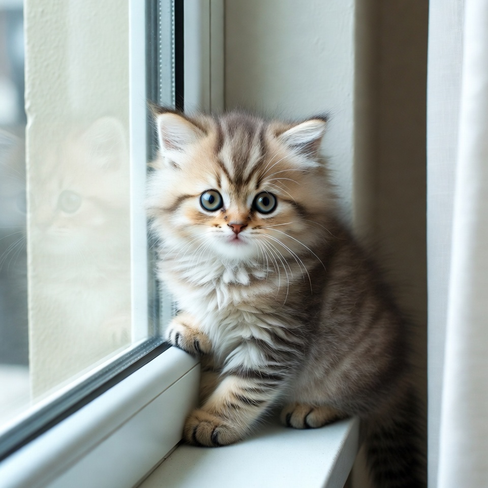A fluffy tabby kitten with light brown and cream fur sits on a windowsill. It gazes curiously through the glass window with large blue-green eyes and paws resting on the ledge. White curtains frame the window behind the adorable young cat.