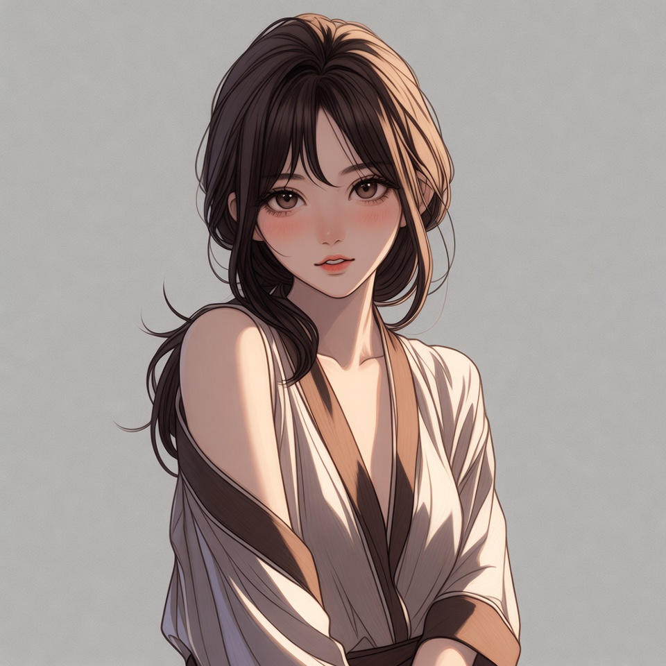 A beautiful anime girl with long wavy brown hair and flushed cheeks wears a white kimono with brown trim. She has large expressive eyes and a gentle smile, standing against a plain gray background. Sunlight highlights her shoulder and the fabric's folds.
