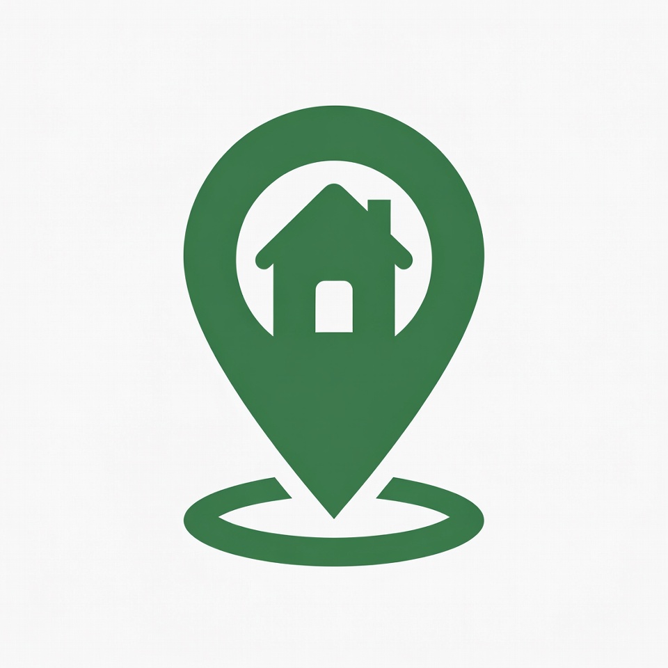 A simple green house icon sits inside a green map pin on a white background. The pin features a circular base and a pointed tip. It is a flat vector illustration with clean lines.