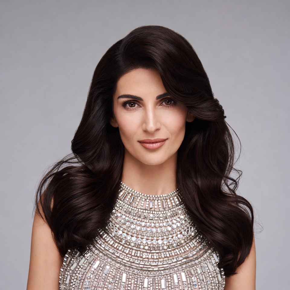 Middle Eastern, beaded dress, beautiful, brown hair, dark hair, elegant, female, gray background, headshot, high neckline, jewelry dress, long hair, makeup, pink lips, portrait, smiling, sparkling beads, studio photo, wavy hair, white dress, woman