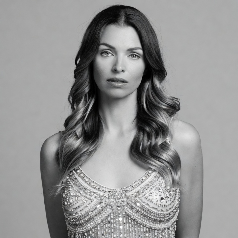 White, beaded dress, black and white, closeup, elegant, fashion, female, gray background, headshot, long hair, portrait, sequins, serious expression, studio, wavy hair, woman