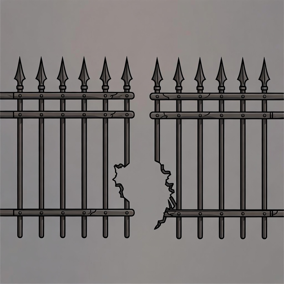 A simple line art illustration depicts a tall wrought iron gate with pointed finials, standing open on a gray background. The right side of the gate features a prominent jagged break, with torn metal edges visible. Vertical bars and cross braces frame the damaged structure.