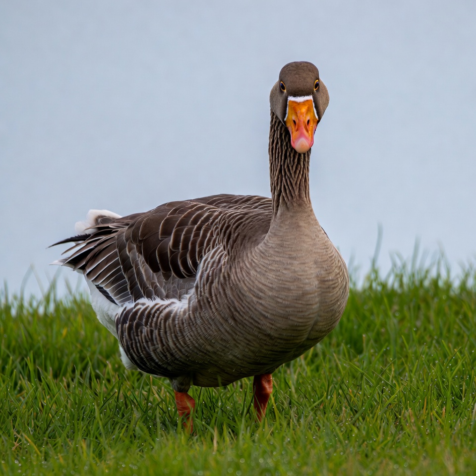 A gray goose with an orange beak stands on green grass facing forward. Its feathers are detailed with white and brown patterns, and orange feet are visible. The background is a blurred light blue sky.