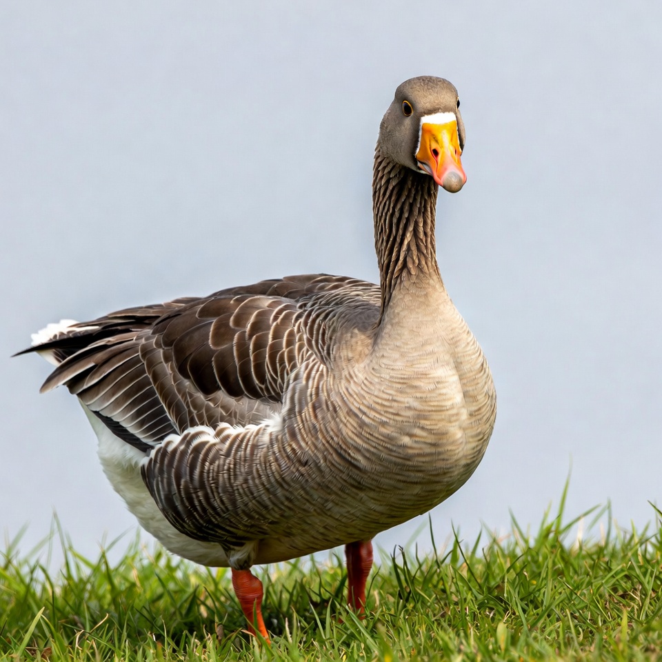 A greylag goose stands on green grass with wings slightly spread. It has a grey body, white underbelly, and bright orange beak. The background is a light blue sky.