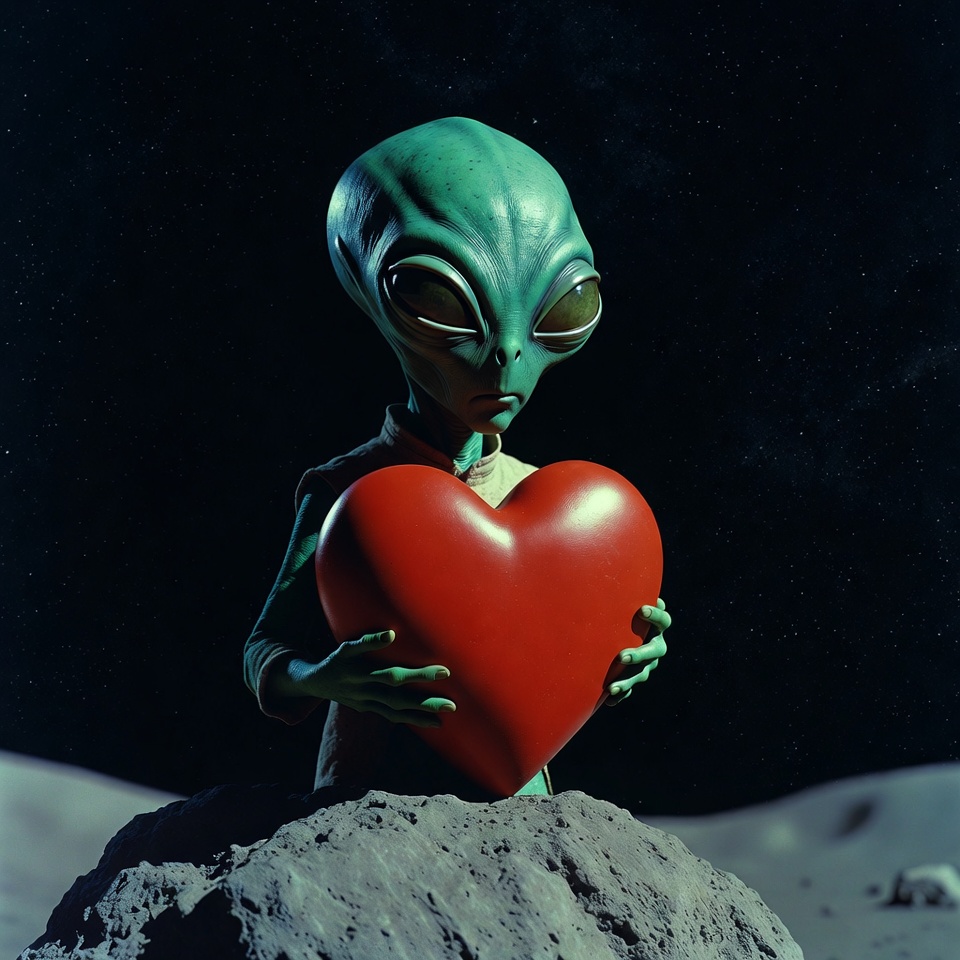 A cute green alien with large black eyes holds a shiny red heart in its hands. It stands on a rocky moon surface with a starry black space background. The alien wears a simple collar and has a gentle expression.