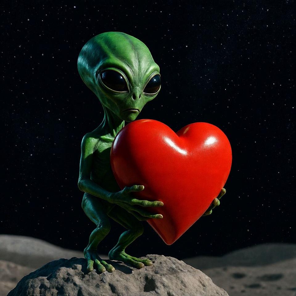 Green Alien Holding Red Heart