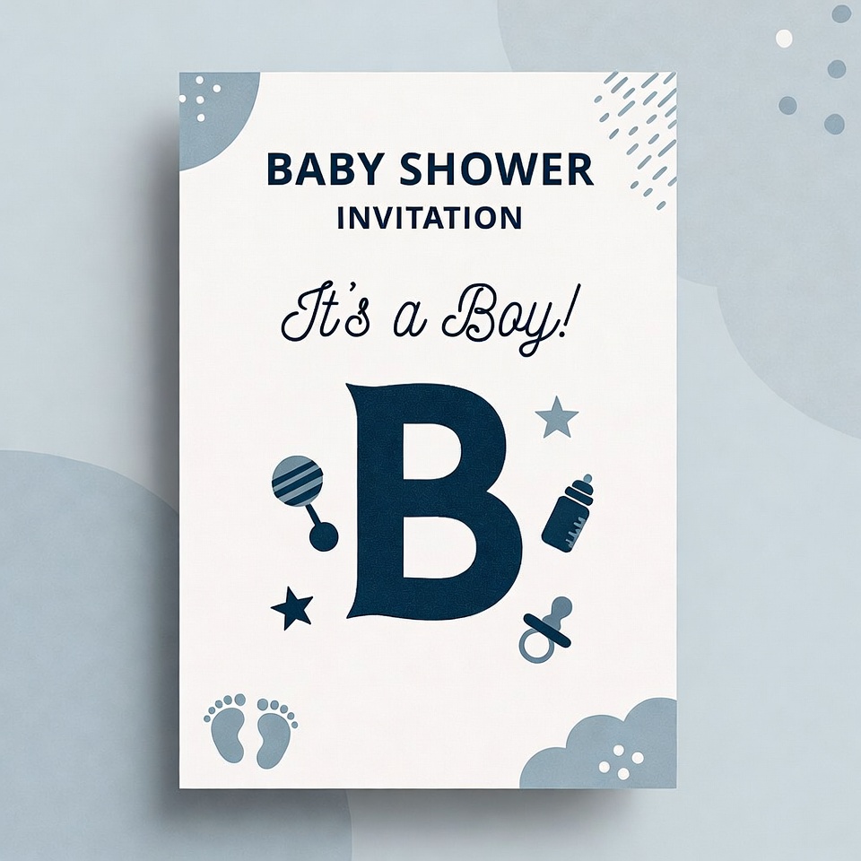 A colorful illustration of a baby shower invitation features 'It's a Boy!' text prominently. It includes a large blue letter B surrounded by baby items like a rattle, bottle, pacifier, star, and baby footprints. The design has soft blue bubbles, raindrops, and clouds on a light background.