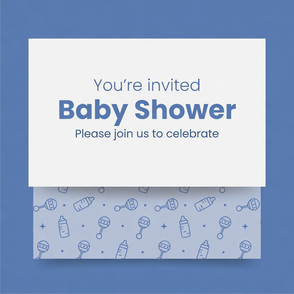 A blue-toned baby shower invitation features 'You're Invited' and 'Baby Shower' text in elegant font on a white card. Below the card is a patterned background with repeating line art icons of baby bottles and rattles. The design uses soft blue colors and clean outlines on a solid blue backdrop.