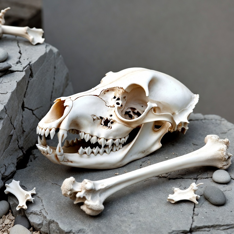 Dog Skull with Bones on Rocks