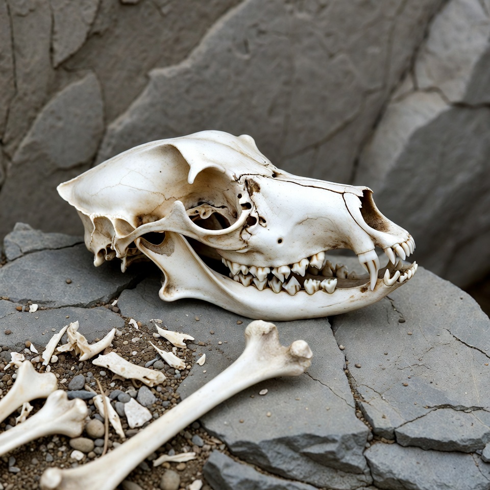 Coyote Skull with Bones on Rocks