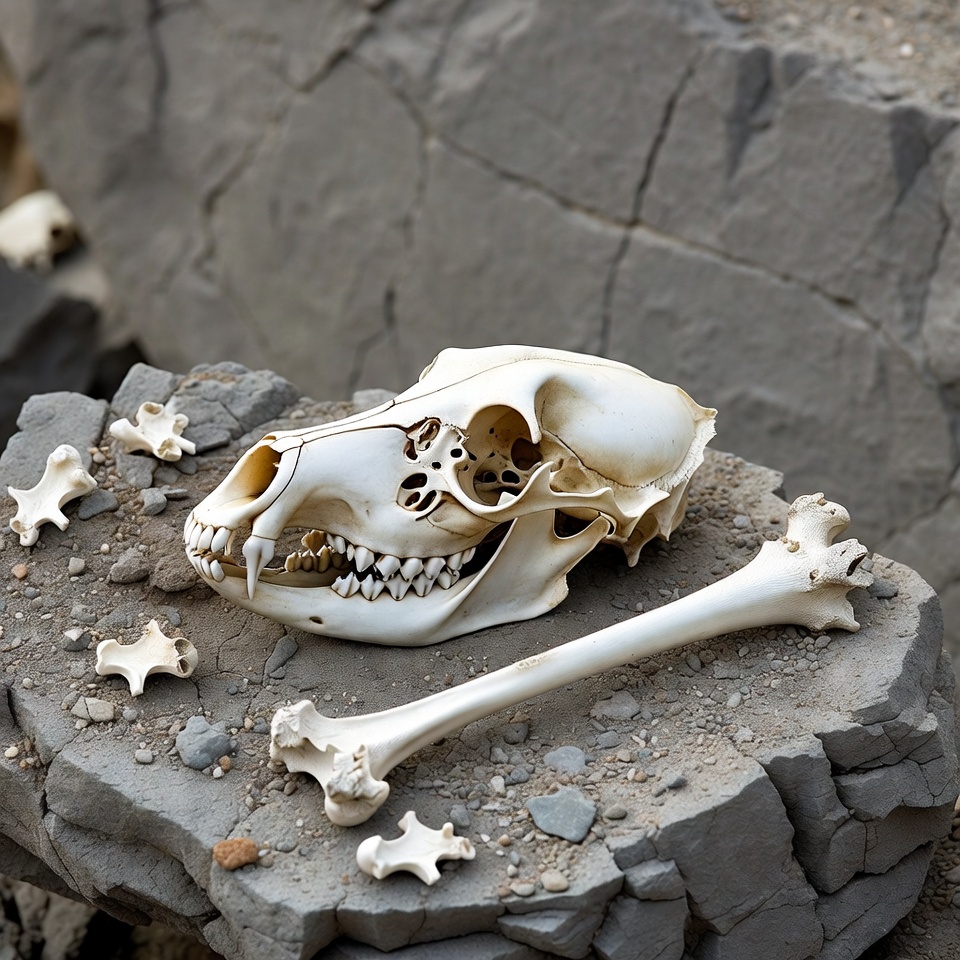 Coyote Skull with Bones on Rocks