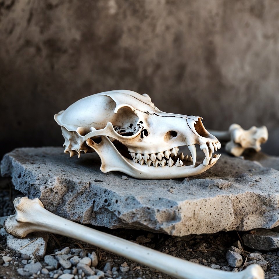 A detailed fox skull with prominent teeth sits on a rough gray rock surface. Scattered bones, including leg bones, surround the skull. The textured stone background highlights the white bones.