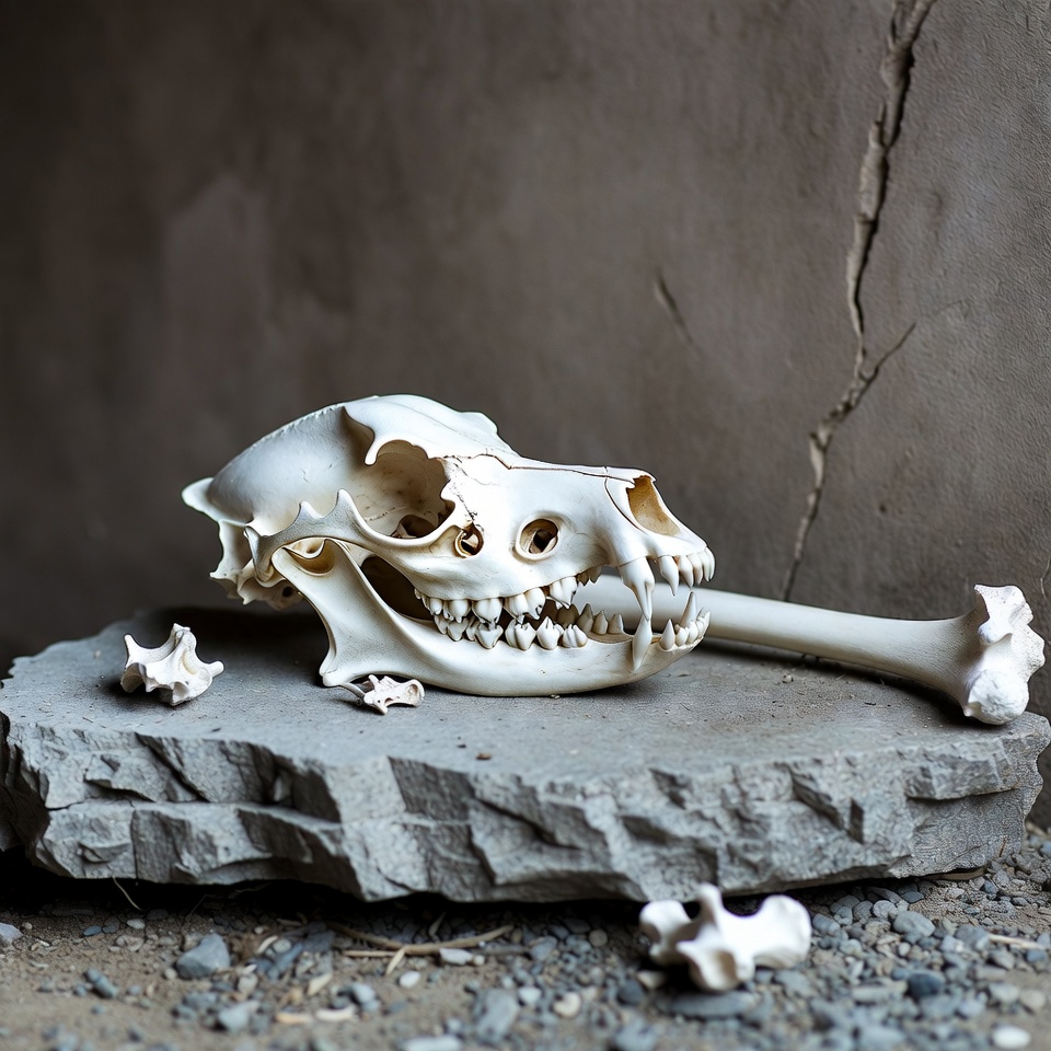 animal bones, animal skull, bones, canine skull, cracked wall, dog bones, gravel, gray stone, isolated background, skeleton, skull, skull closeup, stone slab, white skull, dog skull