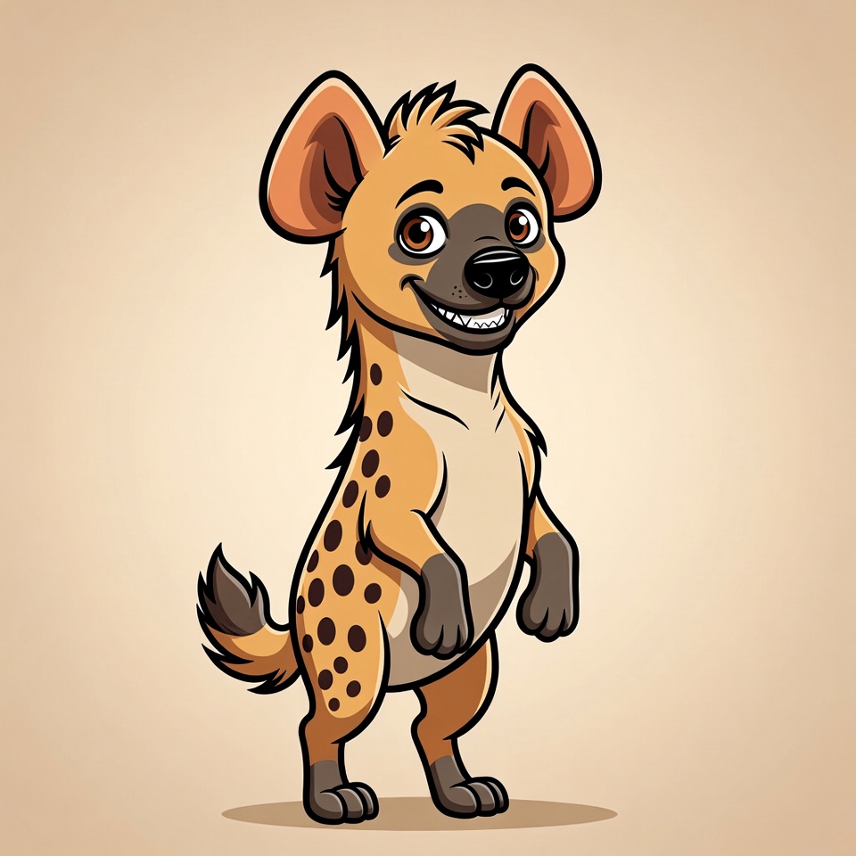 A cute cartoon illustration of a spotted hyena stands on a plain beige background. The hyena has large ears, a fluffy mane, brown spots on its tan fur, and a big smiling mouth with visible teeth. It rears up on its hind legs with expressive eyes and paws raised.