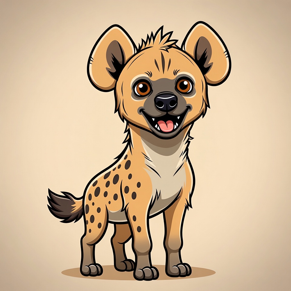 A cute cartoon illustration of a spotted hyena stands on a beige background. The hyena has large ears, a fluffy mane, big expressive eyes, and a smiling mouth with visible teeth. It features tan fur with dark spots and a bushy tail.