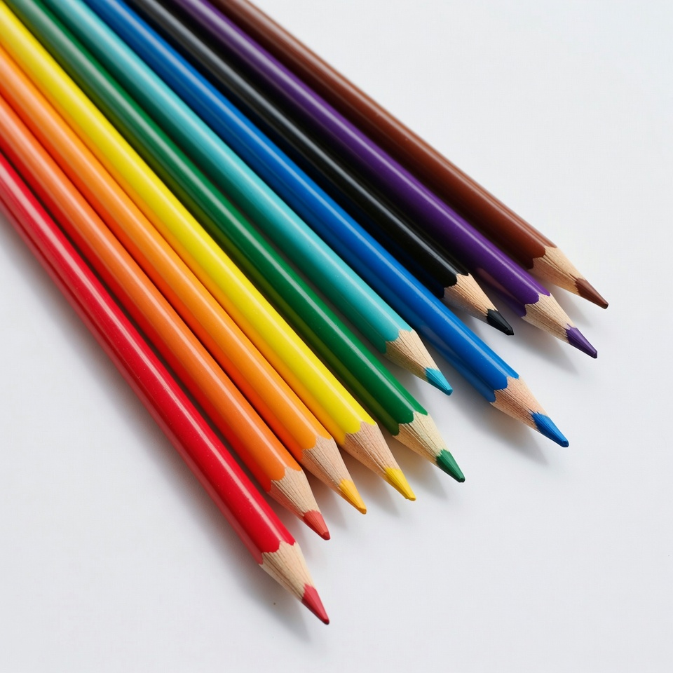 A row of colored pencils in rainbow order lies diagonally on a white background. The pencils feature vibrant hues from red to brown, with sharpened tips pointing upwards. They are neatly aligned, showcasing a full spectrum of colors.