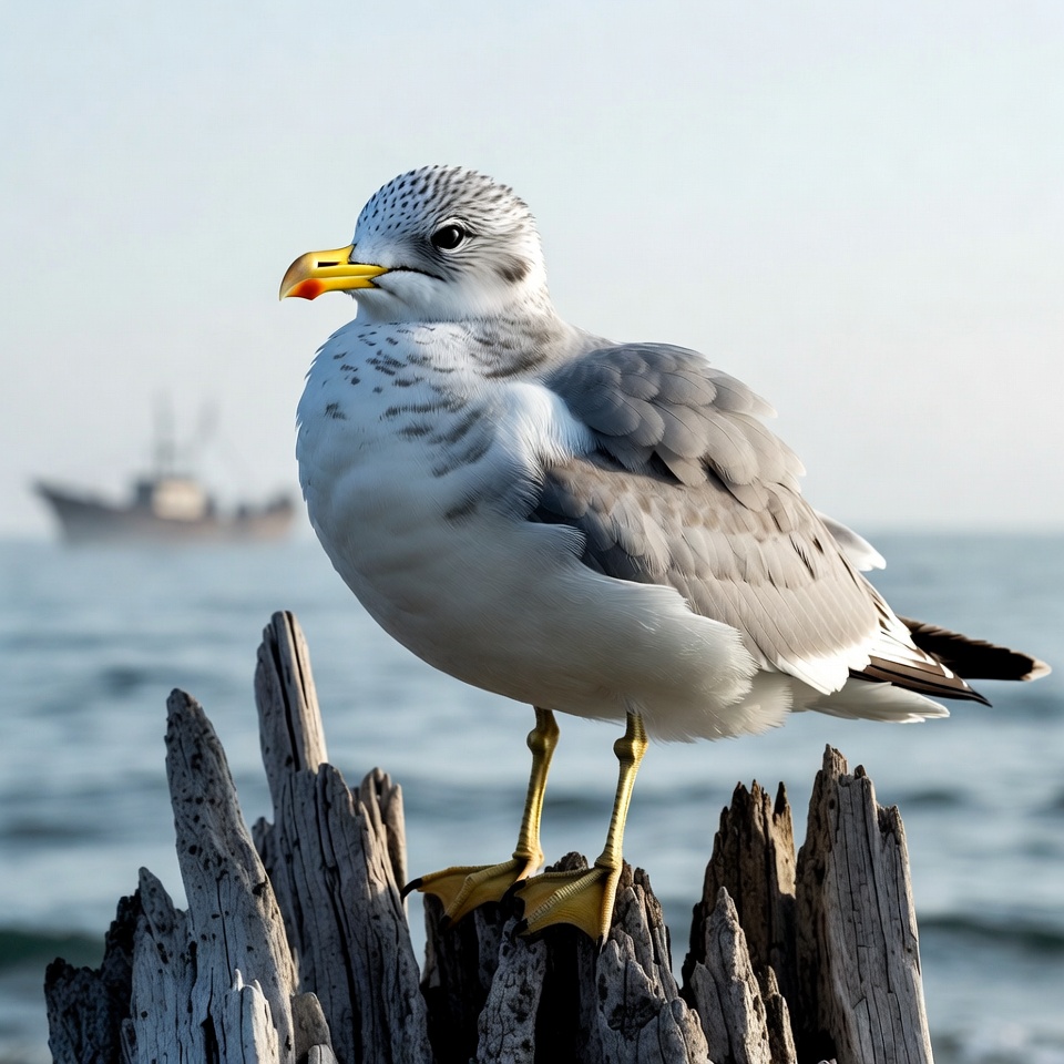 A seagull with gray wings, white body, and yellow beak stands on weathered driftwood logs. A fishing boat is visible in the background on the calm ocean waters under a hazy sky. The bird gazes forward with its distinctive black eye markings.