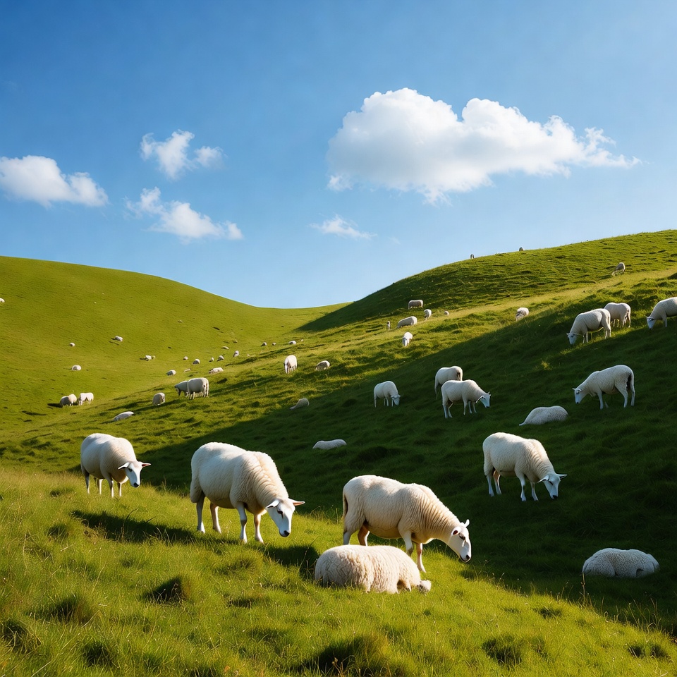 A herd of white sheep grazes on lush green rolling hills under a bright blue sky with scattered white clouds. The sheep are scattered across the grassy slopes, some standing and others lying down. Sunlight illuminates the vibrant landscape.