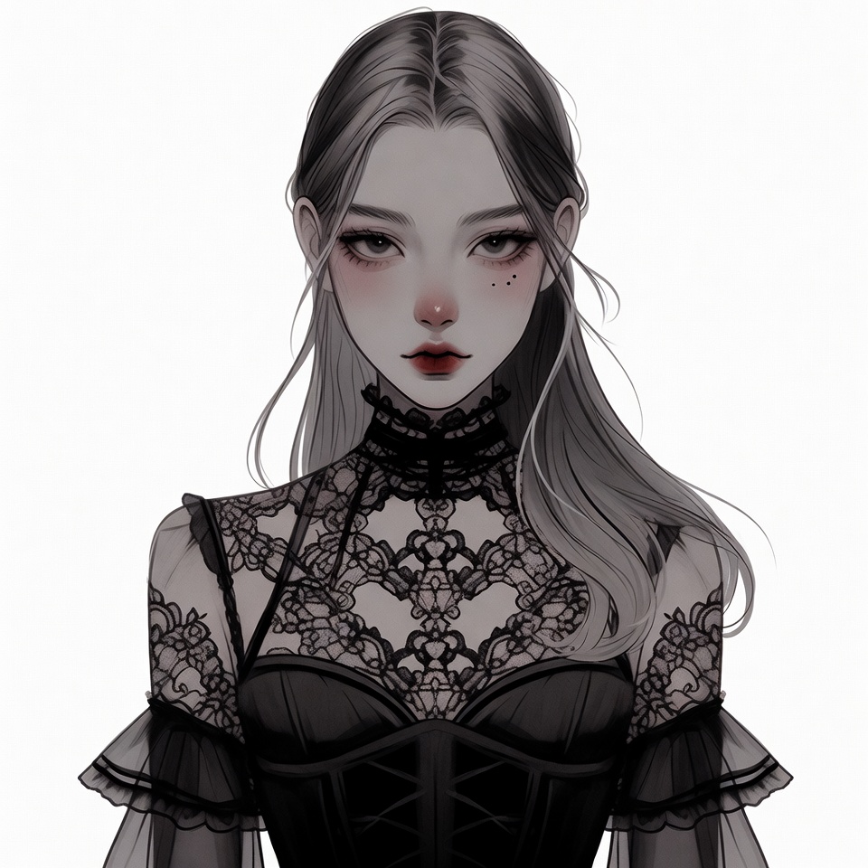 Asian, anime style, beauty mark, black corset, choker, dark aesthetic, digital art, dramatic makeup, elegant, fashion, female, floral patterns, gothic, high collar, illustration, intricate lace, isolated background, lace dress, ponytail, portrait, puffed sleeves, red lips, silver hair, woman