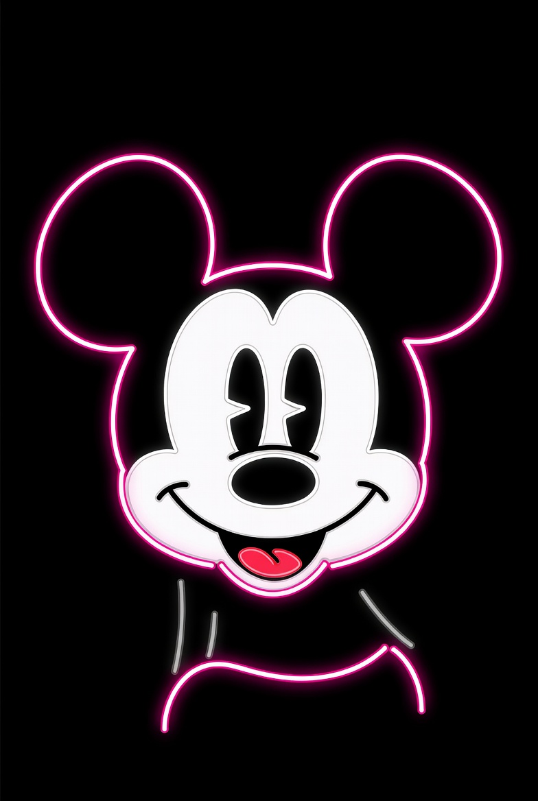A neon-style illustration of Mickey Mouse with large pink glowing ears and a white face against a black background. He has big expressive eyes, a wide smiling mouth with tongue visible, and black outlines. The design features pink neon glow effects on the ears and outlines.