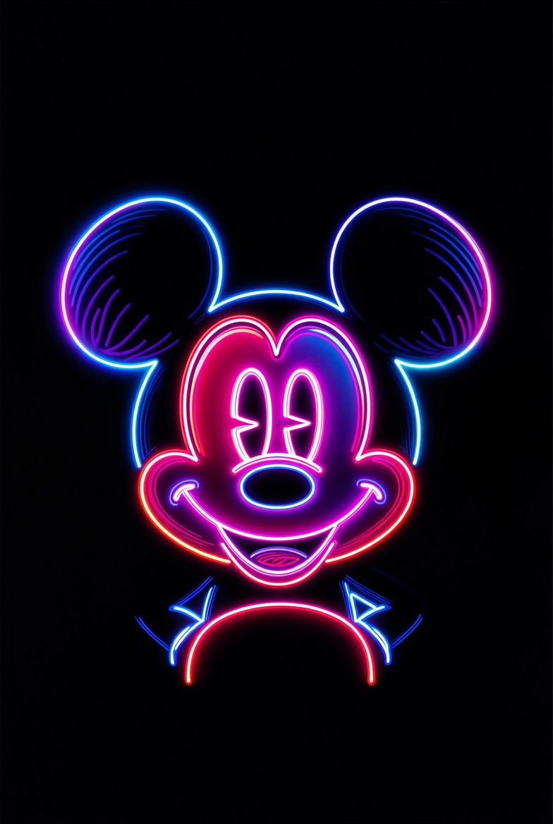 Disney character, Mickey face, big ears, black background, blue neon, cartoon character, cartoon mouse, clipart, glowing effect, illustration, isolated background, neon Mickey, neon glow, pink neon, purple neon, smiling Mickey, vibrant colors, Mickey Mouse