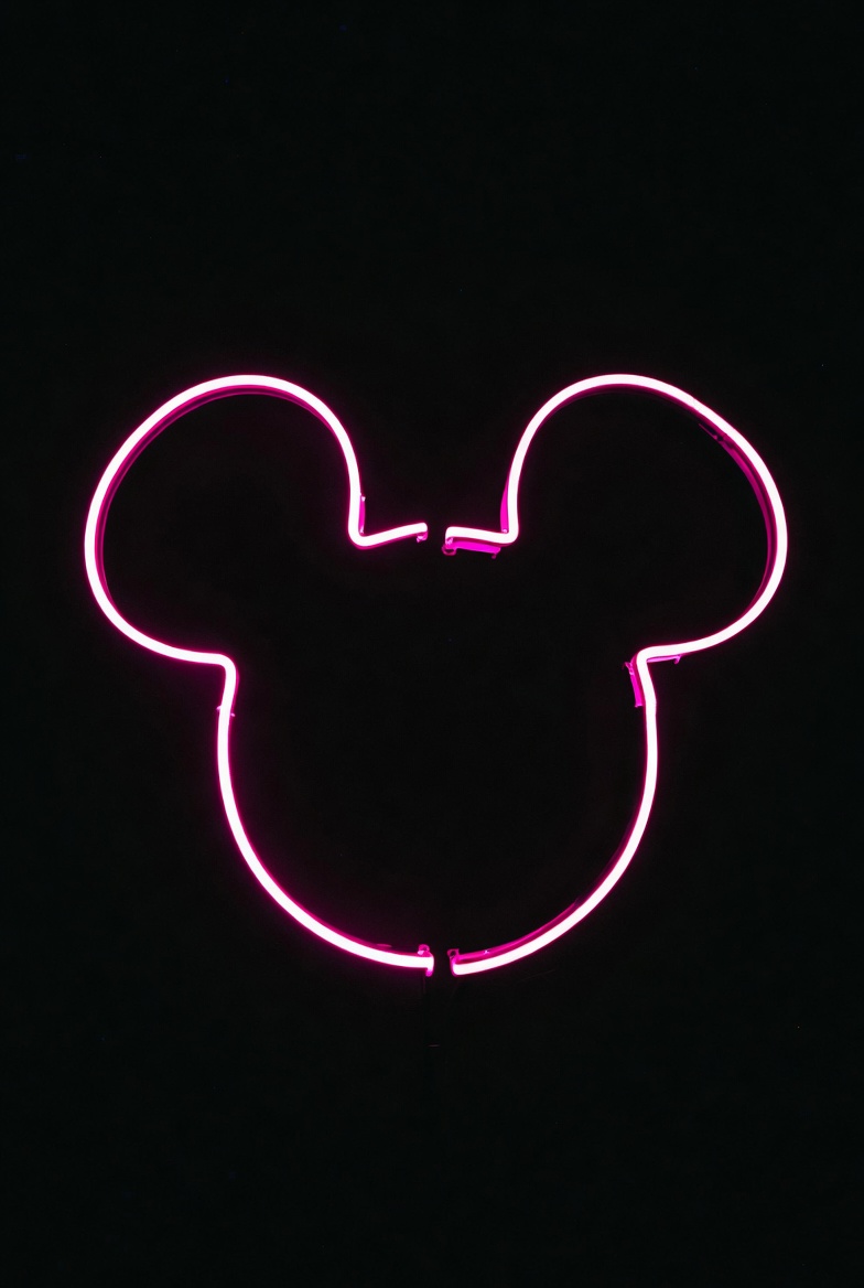 Disney character, Disney icon, Mickey ears, Mickey head, black background, cartoon silhouette, decorative sign, glowing sign, isolated background, neon light, neon outline, neon sign, pink neon, vibrant pink, Mickey Mouse