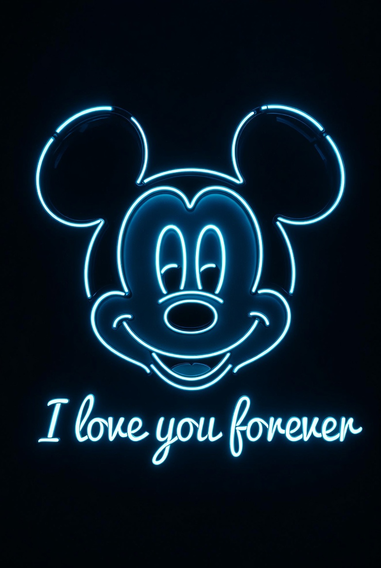 Disney character, I love you forever, black background, blue glow, cartoon, clipart, glowing sign, heart message, illustration, isolated background, mouse character, neon, romantic text, smiling face, Mickey Mouse