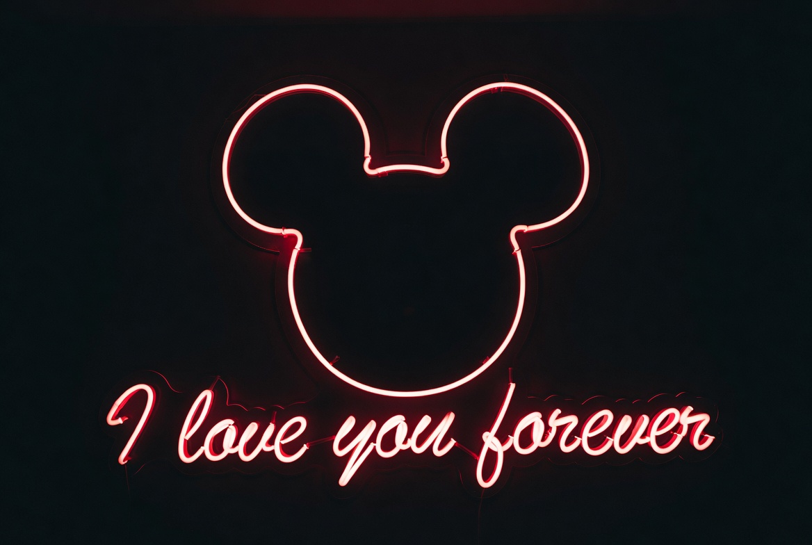 Disney, Disney character, I love you forever, Valentine's, cartoon character, dark background, forever love, glowing sign, heart message, illuminated text, love quote, mouse ears, neon art, neon sign, outline design, pink neon, red neon, romantic sign, silhouette, Mickey Mouse