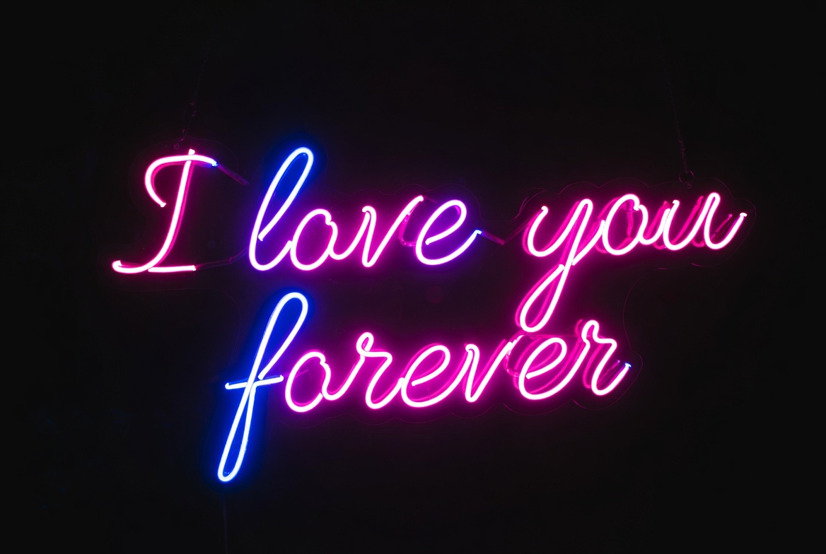 I love you, black background, blue neon, cursive font, forever, glowing letters, glowing text, heart symbol, illuminated sign, love forever, love message, love quote, neon lights, pink blue neon, pink neon, romantic decor, romantic sign, sign art, valentine, neon sign