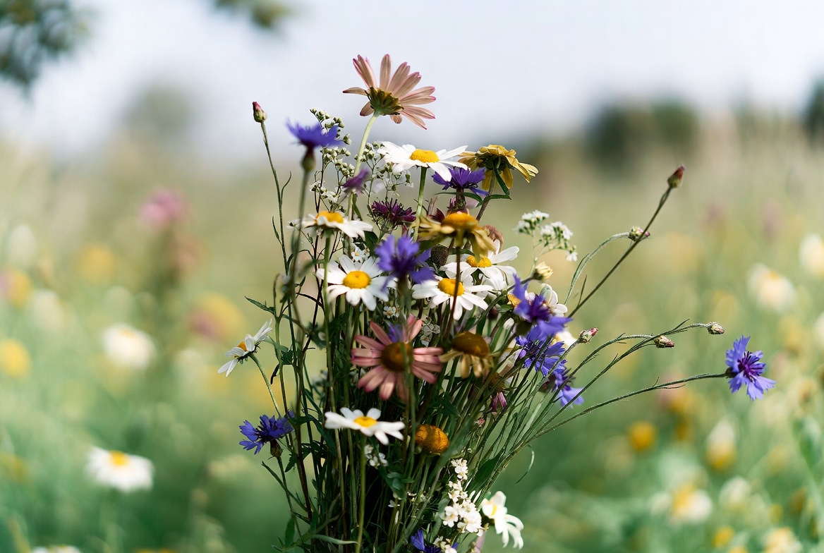 bloom, bouquet, colorful flowers, cornflowers, daisies, field, flora, flower arrangement, flowers, fresh flowers, garden, green field, meadow, natural background, nature, outdoor flowers, petals, pink flowers, purple flowers, stems, summer flowers, white flowers, wild blooms, wildflowers