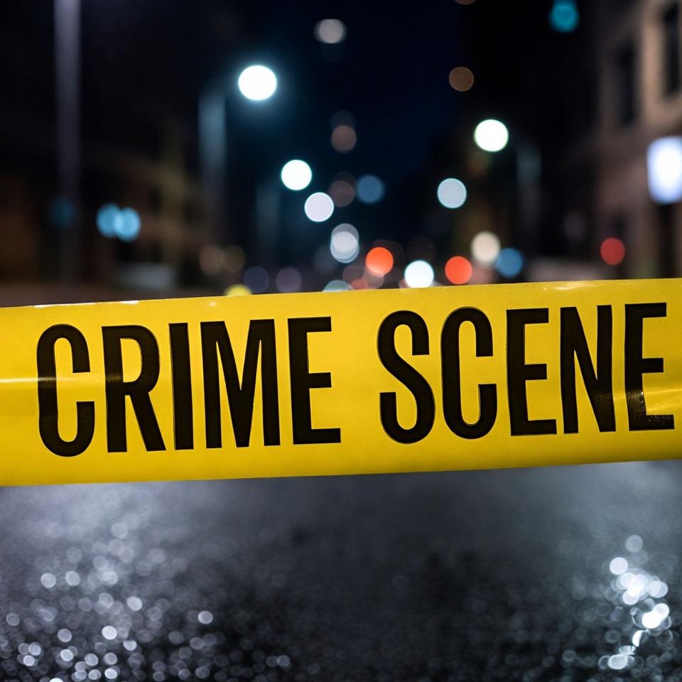 Yellow crime scene tape stretches across a dark urban street at night. Bright streetlights illuminate the bold black 'CRIME SCENE' text on the tape. Blurred city lights and buildings create a bokeh background on the wet pavement.