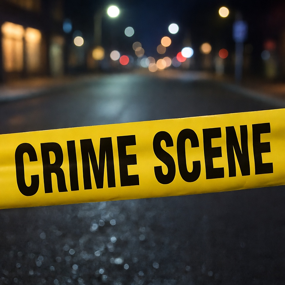 blurred lights, caution tape, city background, dark night, do not cross, emergency tape, night street, nighttime scene, police tape, roadblock tape, street lamps, urban street, wet road, yellow tape, crime scene tape