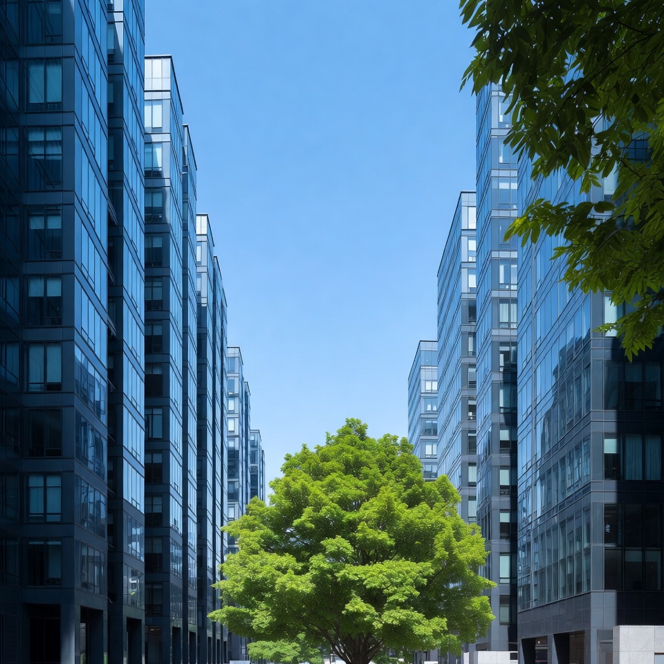 architecture, blue sky, buildings, city street, cityscape, clear sky, ginkgo tree, glass buildings, glass facade, high-rises, lush leaves, modern architecture, nature, reflective windows, skyscrapers, street view, sunny day, tall buildings, tree, urban, urban landscape, green tree