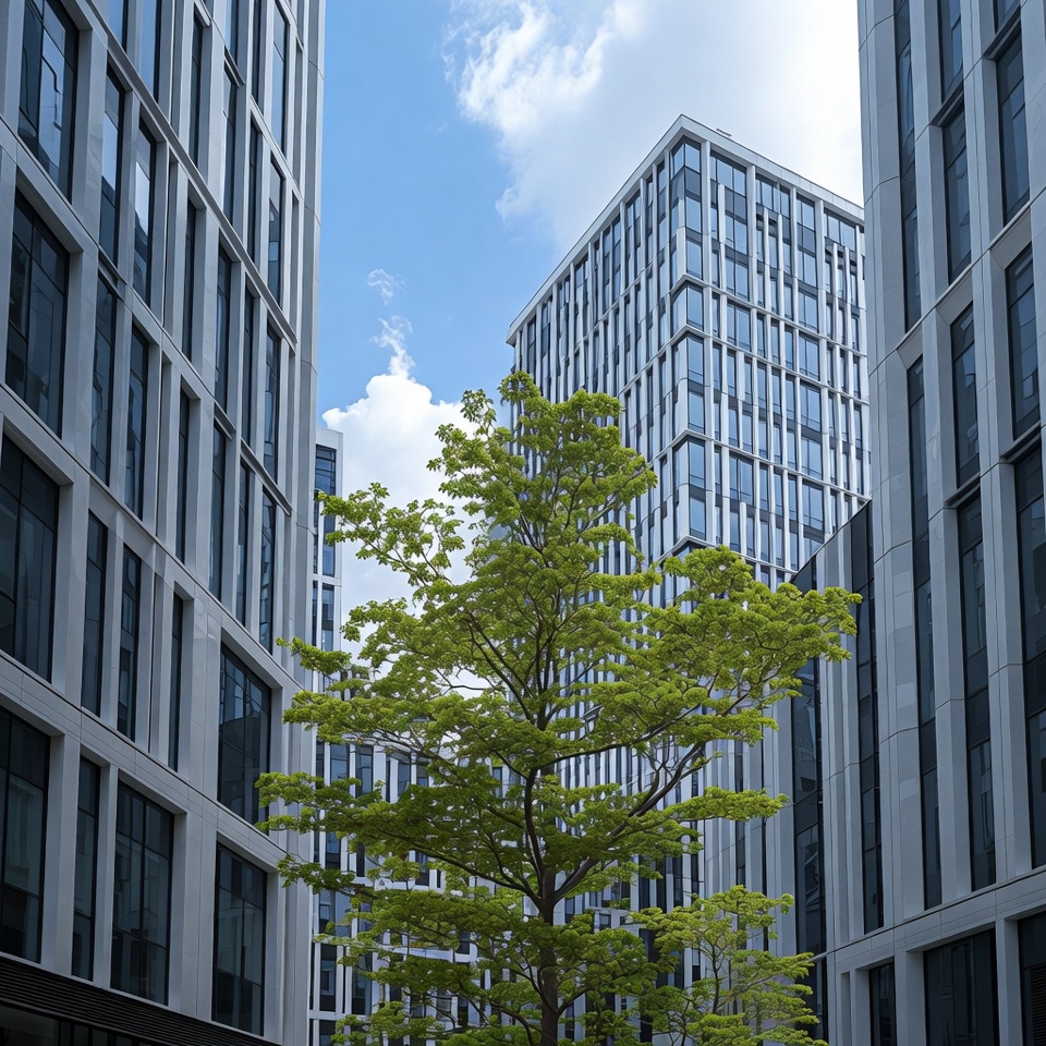 A young green tree stands in the center of a narrow urban courtyard surrounded by tall modern glass skyscrapers. The buildings feature reflective glass facades and grid-like window patterns under a partly cloudy blue sky. Fresh green leaves on the tree contrast with the sleek architecture.