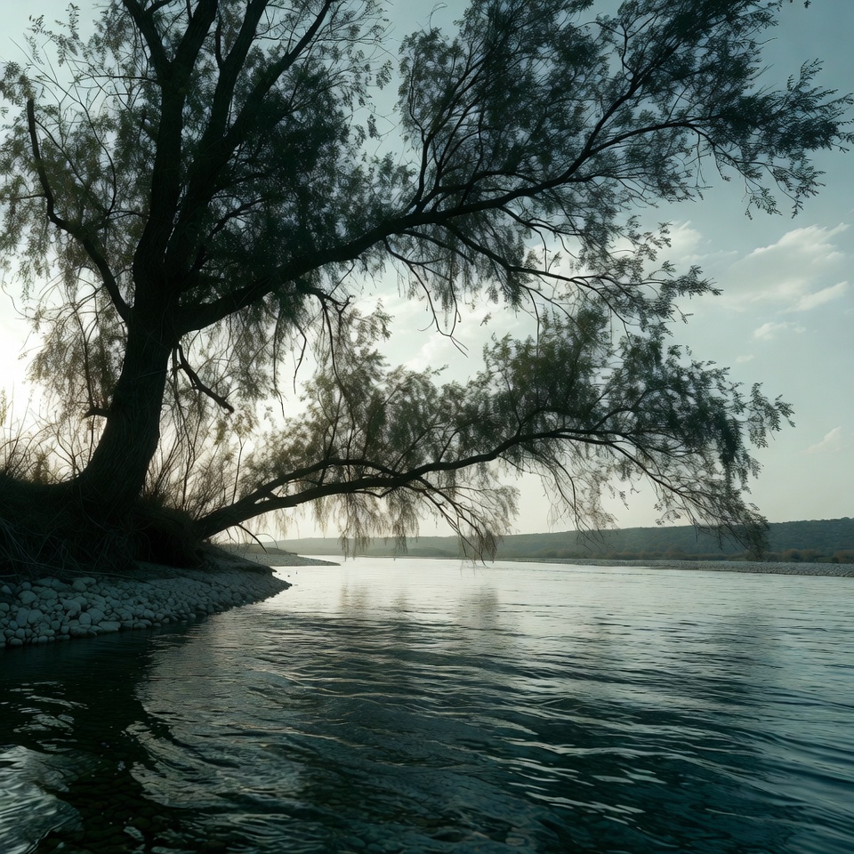bank, blue water, branches, calm river, cloudy sky, drooping branches, environment, foliage, greenery, landscape, nature, outdoors, pebbles, reflection, river, riverbank, rocks, scenic, shore, tall tree, tree, water, waterway, willow tree, weeping willow
