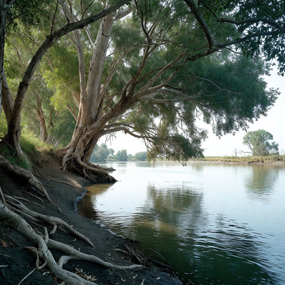 Tall eucalyptus trees with white trunks and green leaves line a muddy riverbank. Exposed roots extend into the calm, reflective river water. The scene features lush foliage overhanging the serene waterway.
