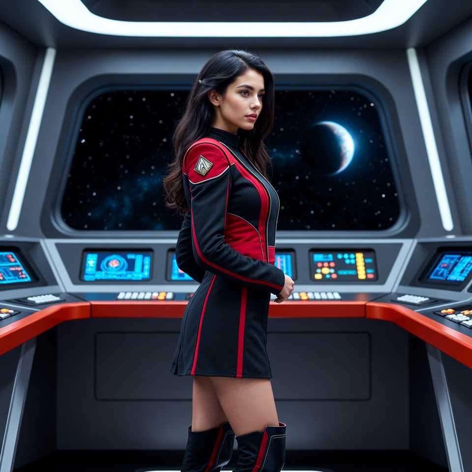 A young woman with long dark hair stands on a futuristic spaceship bridge. She wears a form-fitting black and red uniform with shoulder patches and high boots. Behind her, a large window shows a starry space view with a crescent moon, flanked by glowing control panels.