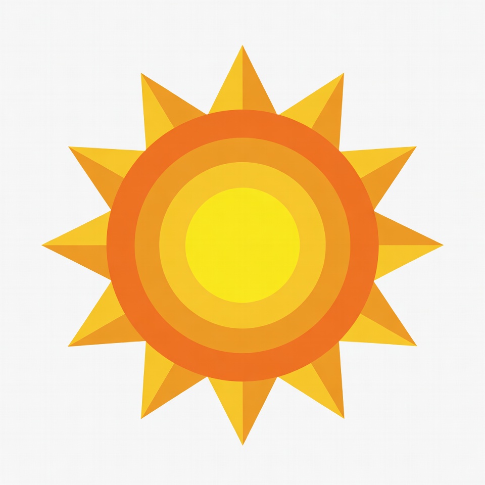 A vibrant cartoon sun with a yellow center and orange gradients is depicted on a white background. It features sharp, pointed rays extending outward in a symmetrical pattern. The illustration uses bold, flat colors typical of clipart style.