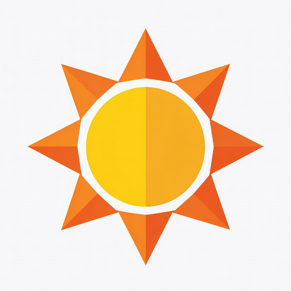 A flat geometric sun icon features a yellow-orange center circle with eight pointed orange rays. The design uses sharp polygonal shapes in vibrant orange and yellow tones. It is isolated on a white background.