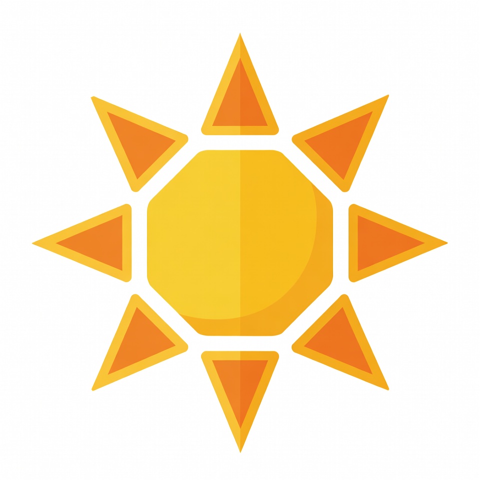 A vibrant yellow sun icon features a hexagonal center with eight orange triangular rays extending outward. The design uses flat colors and clean geometric shapes. It is isolated on a white background.