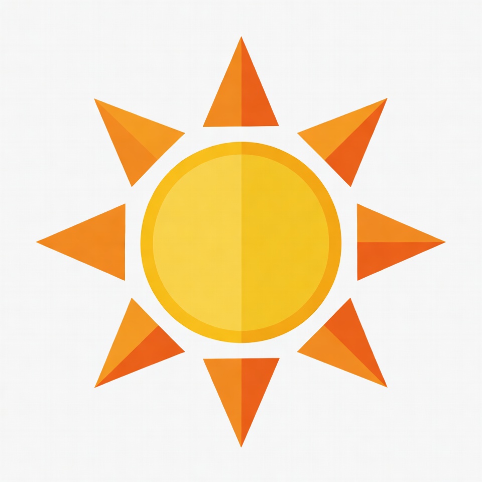 A vibrant orange sun icon features a yellow center circle with eight pointed rays. The design uses flat colors and sharp geometric shapes. It is isolated on a white background.