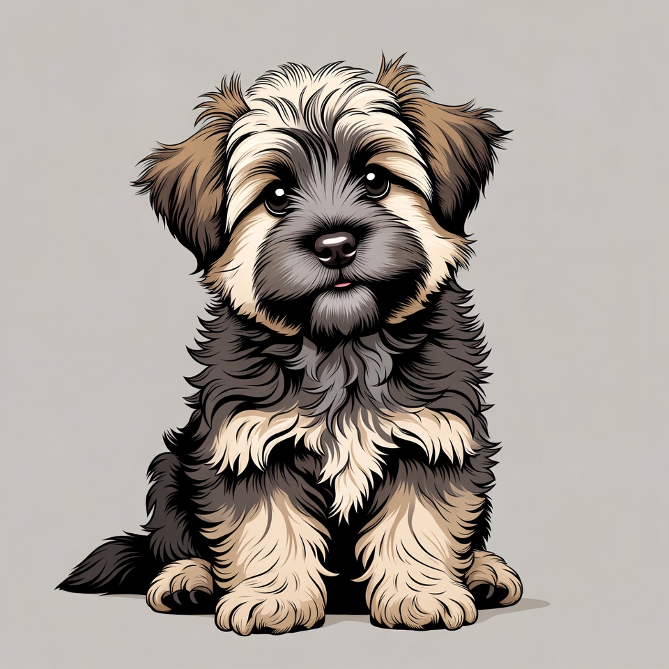 An adorable fluffy puppy with brown and white fur sits on a plain gray background. The illustration features expressive dark eyes, a small pink tongue, and soft, wavy fur around its face and paws. The detailed vector art highlights the puppy's playful and charming appearance.