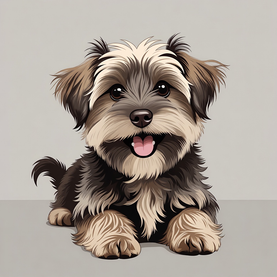 A fluffy Yorkshire Terrier puppy with brown and tan fur sits on a plain gray background in a detailed vector illustration. The puppy has big expressive eyes, a pink tongue sticking out, and perky ears. It lies down with front paws extended forward.