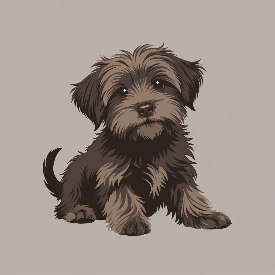 A digital illustration of a fluffy brown puppy sitting on a light gray background. The puppy has shaggy fur, expressive eyes, and a small pink nose. Its paws are visible, and its tail curls slightly.