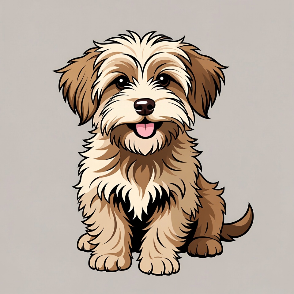 A cartoon illustration of a fluffy brown and white puppy with long fur sits on a plain gray background. The puppy has big expressive eyes, a small black nose, and a happy open mouth showing its tongue. Its fur is detailed with soft waves and curls.