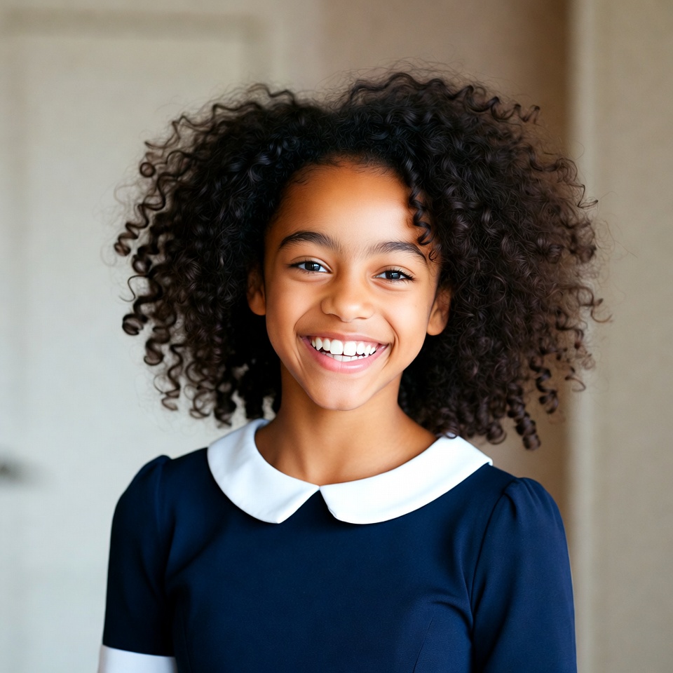 A young African-American girl with voluminous curly hair smiles brightly at the camera. She wears a navy blue dress with a white Peter Pan collar. She stands indoors against a light-colored wall near a door.