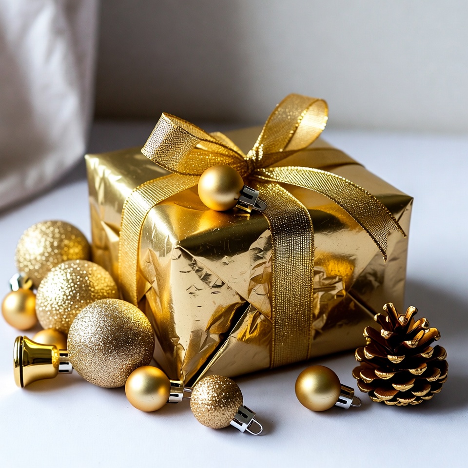 Christmas gift, Christmas ornaments, festive gift, gift box, gold balls, gold bow, gold ribbon, holiday decoration, isolated, luxury present, ornament balls, pine cones, shiny gold, white background, wrapped present, gold gift box