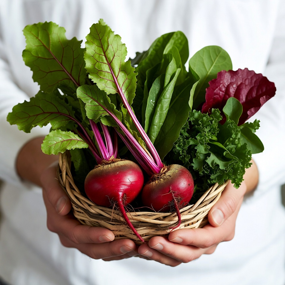 A pair of hands holds a woven basket containing fresh red beets and various green leafy vegetables including spinach and kale. The vibrant beet roots protrude from the basket, surrounded by lush green and purple leaves. The vegetables are fresh and displayed prominently against a white background.