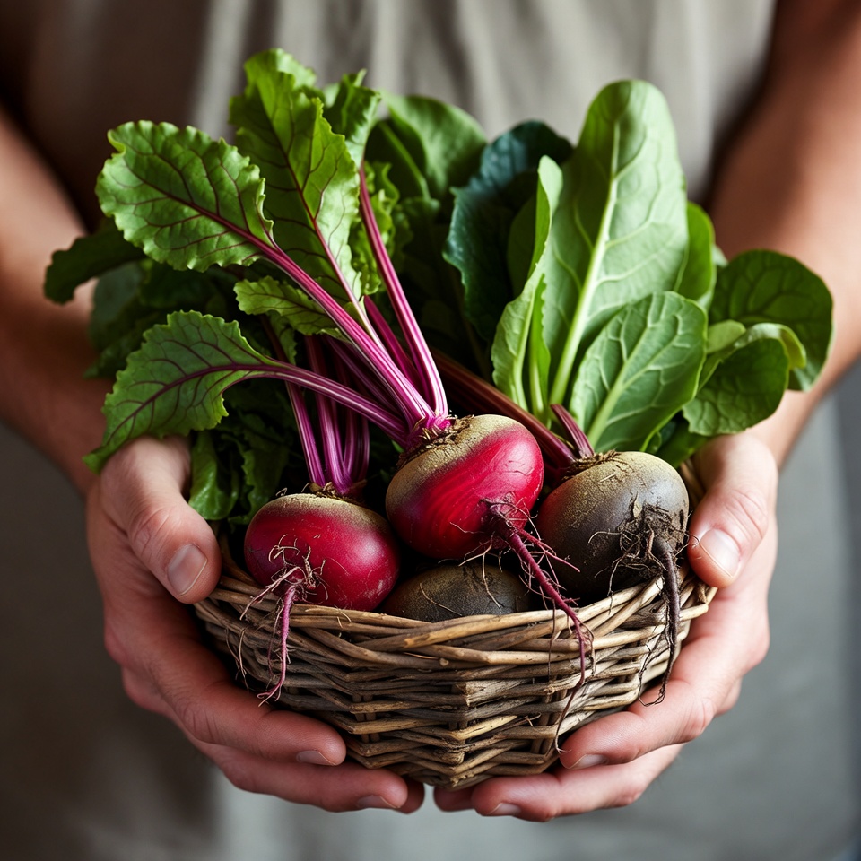 A man with muscular arms holds a woven basket filled with fresh beets and green beet leaves. The beets feature vibrant red skins and tops with some soil visible. His hands grip the basket firmly against a neutral background.
