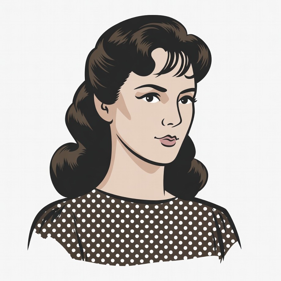 A stylized illustration of a woman with wavy brown hair styled in a retro updo faces slightly to the side. She wears a dark polka dot dress with white dots and has subtle makeup with red lips. The image features clean line art on a white isolated background.